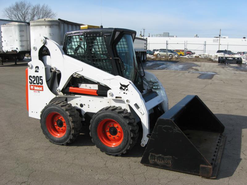 Bobcat S205 with attachments: forklift, push bucket & teeth bucket